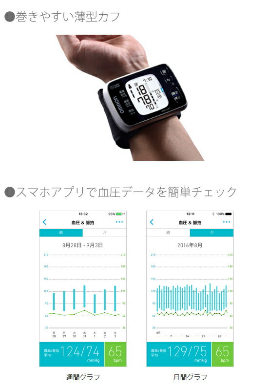 ◆使いやすい気配り設計・手首にぴったりフィットする、巻きやすい薄型カフ ・直近10分以内に測定した3回分の平均値を表示・100回/2人分の過去の血圧値を記録し、表示するメモリ機能 ※日本高血圧学会「高血圧治療ガイドライン2009」では、家庭で血圧を測った場合、最高135mmHg/最低85mmHgが高血圧の基準とされています。